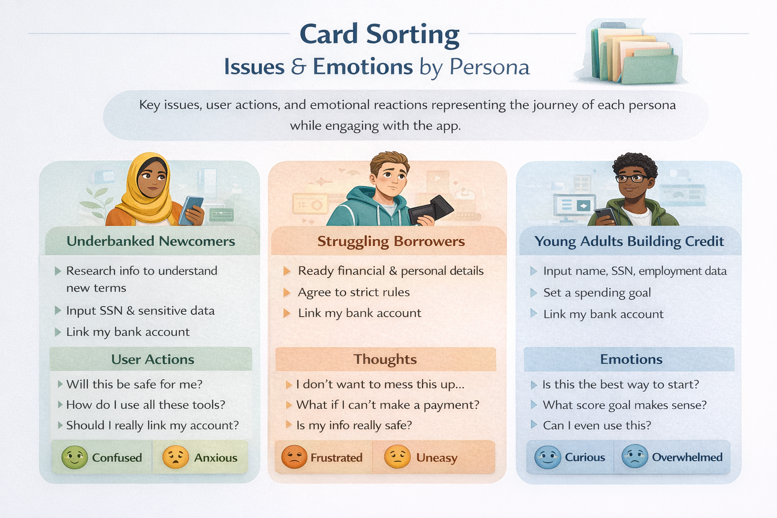 A card sorting exercise mapping issues, actions, and emotional reactions by persona surfaced something critical: each user arrives with a fundamentally different internal question. The interface couldn't ask which one applies — it had to answer all three passively, through the sequencing and framing of individual screens.