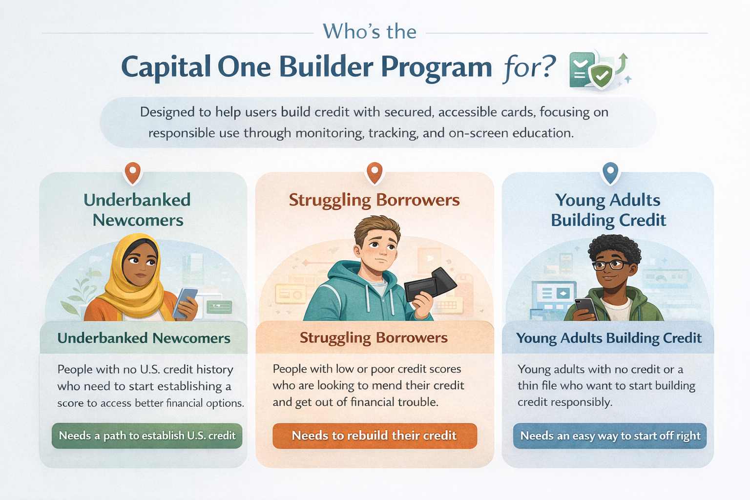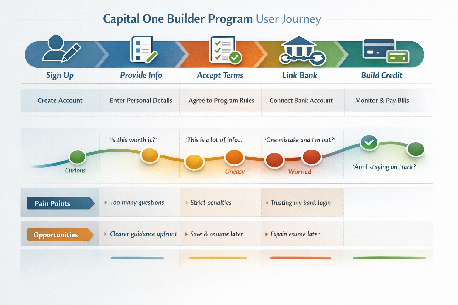 The Capital One Builder Program is a secured credit card product targeting people with no credit history, damaged credit, or limited banking access. The core value proposition is straightforward: make consistent monthly payments for 12 months, graduate to an unsecured card. But the onboarding flow wasn't doing the product justice.