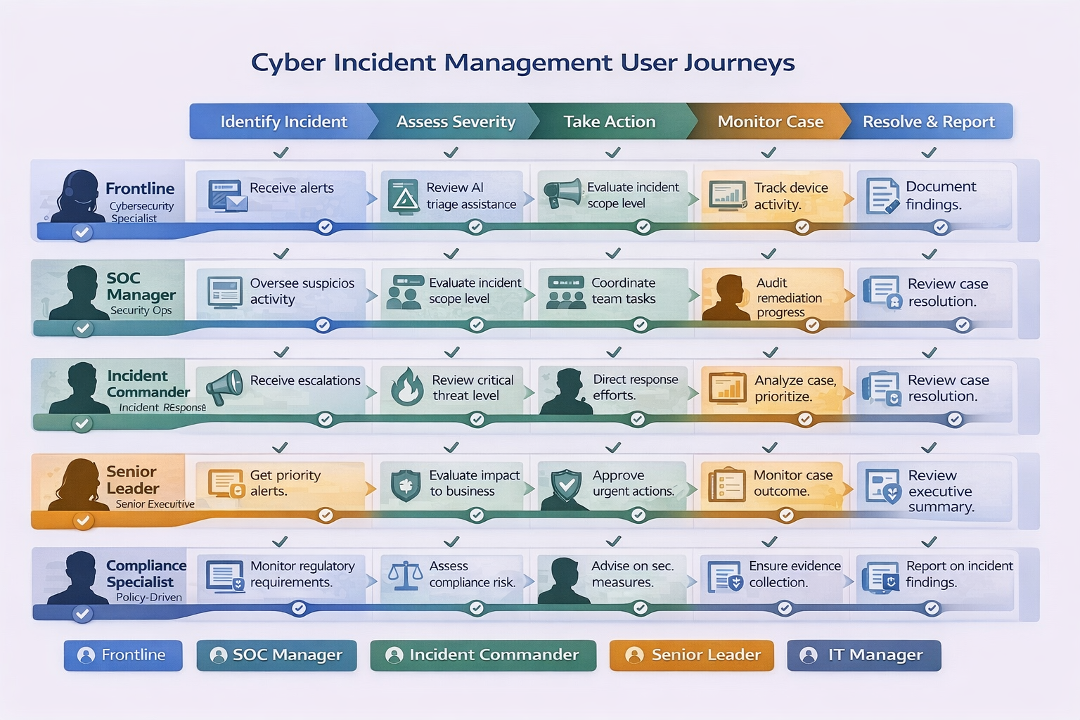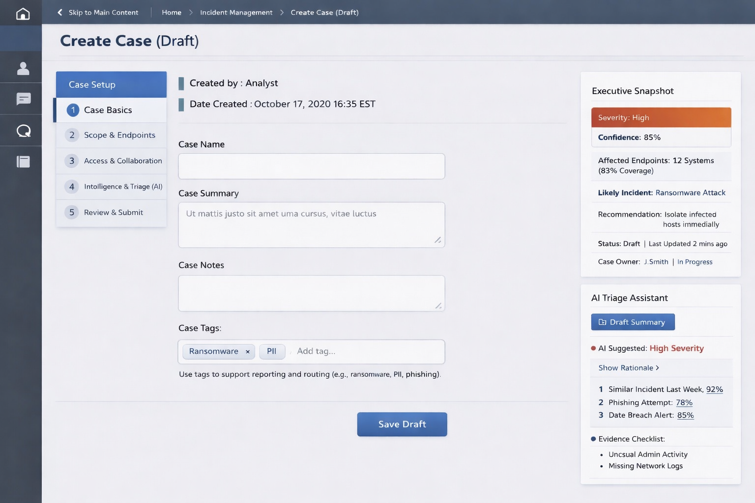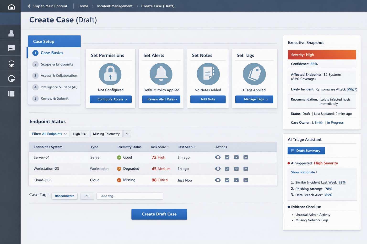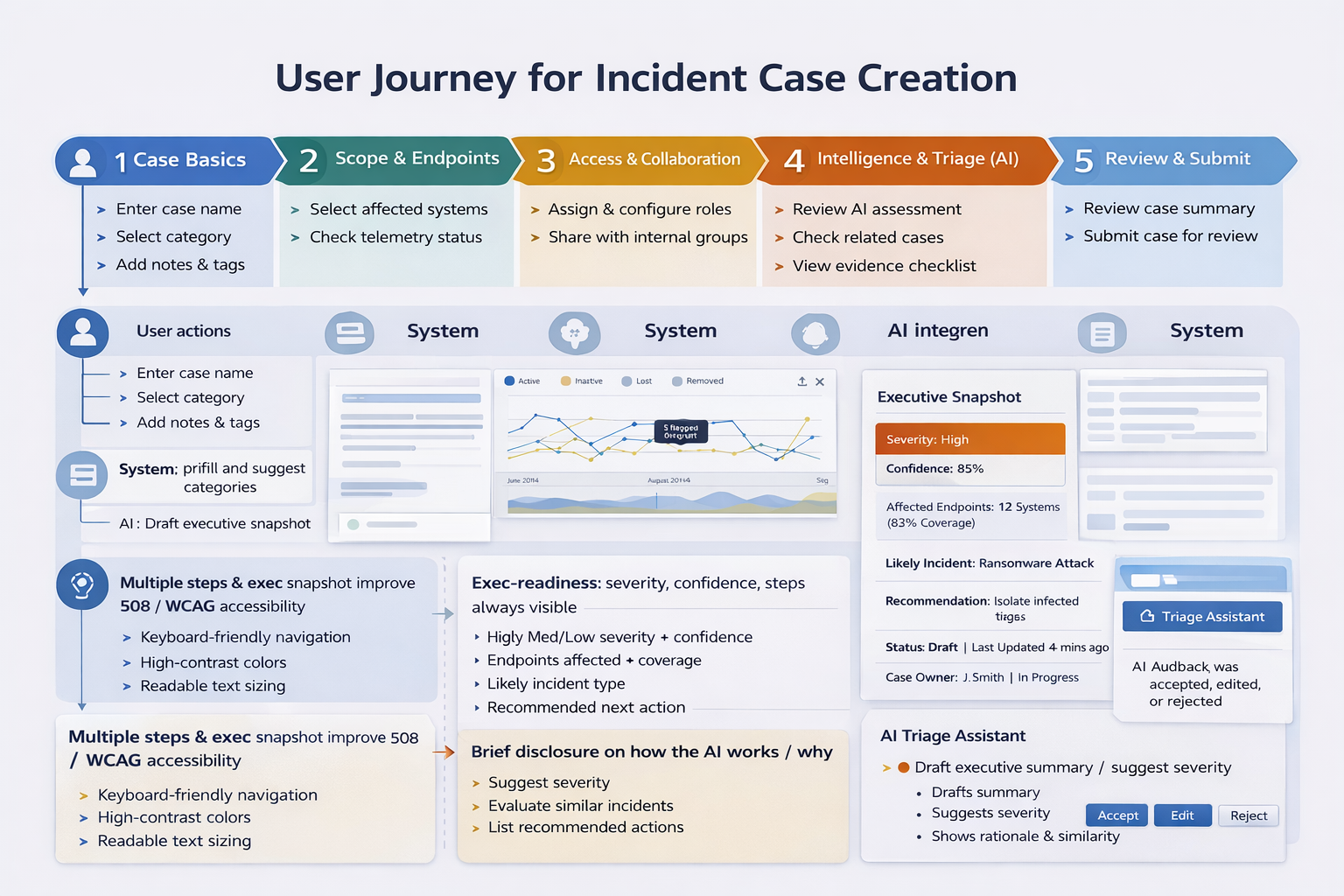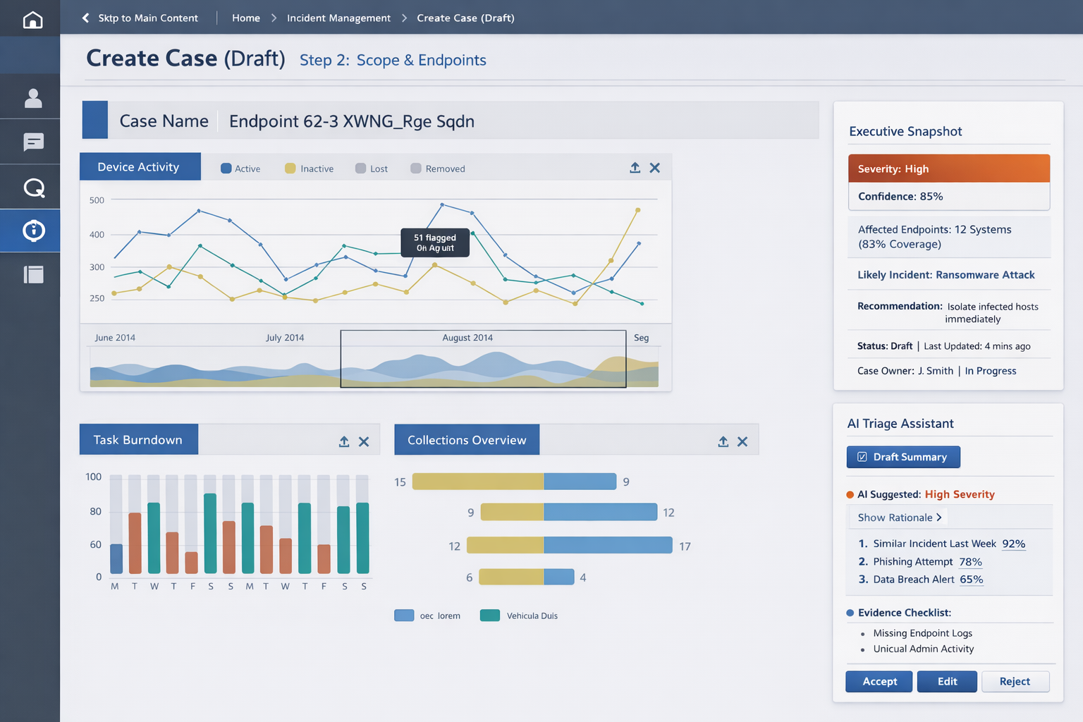 An enterprise-grade cybersecurity incident reporting platform built within the Tableau framework, designed to support six distinct roles — from frontline analysts to compliance leads — through a coordinated, end-to-end response workflow. The application spans AI-assisted incident triage, real-time endpoint monitoring, case documentation, task burndown, and device activity analytics, enabling teams to detect, scope, and report threats with speed and precision.