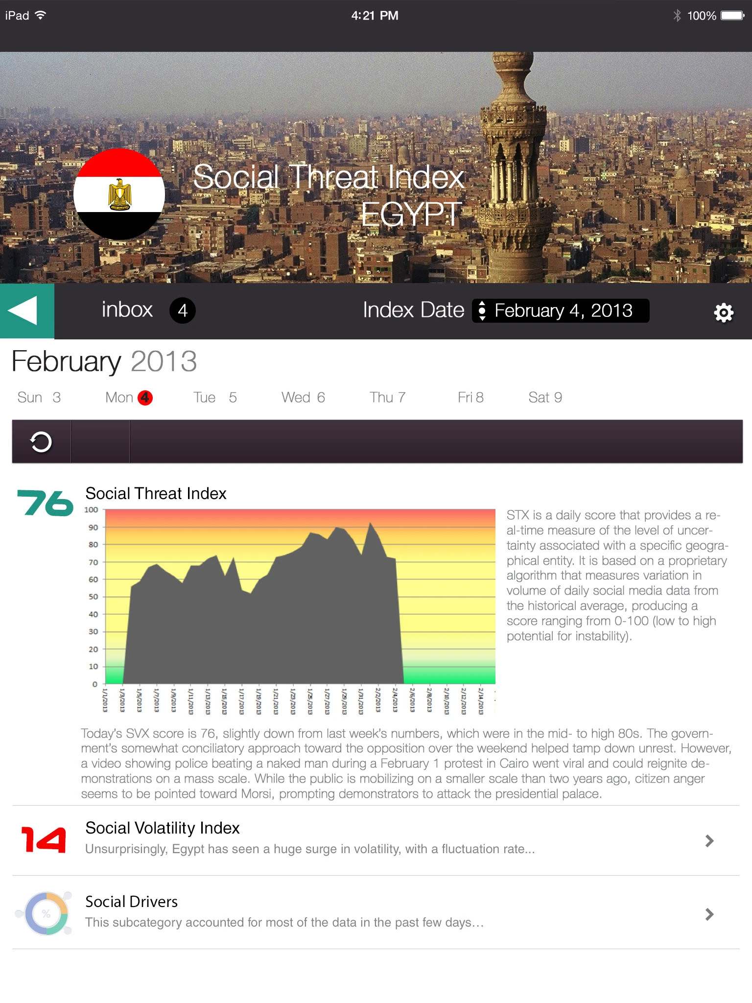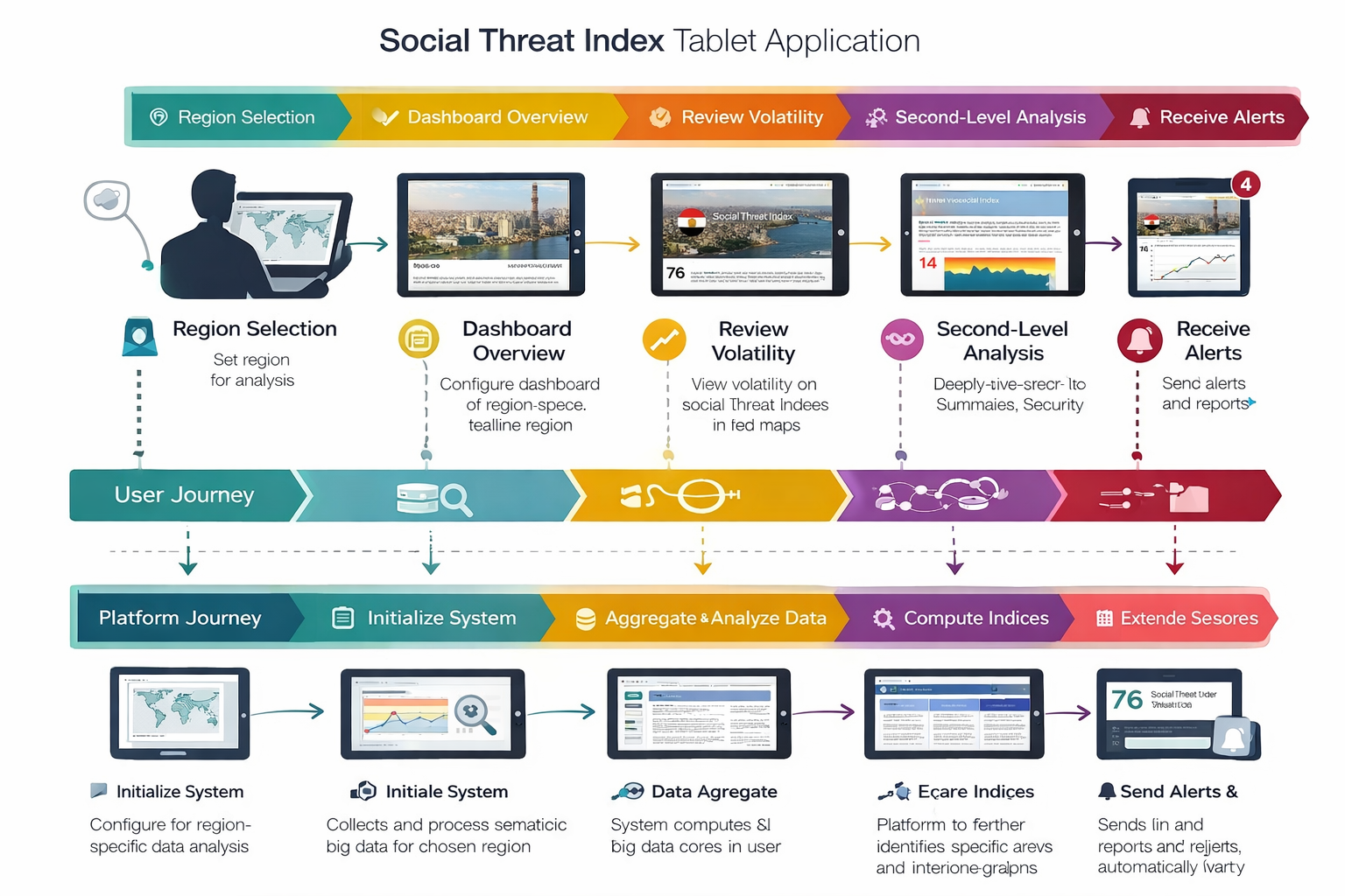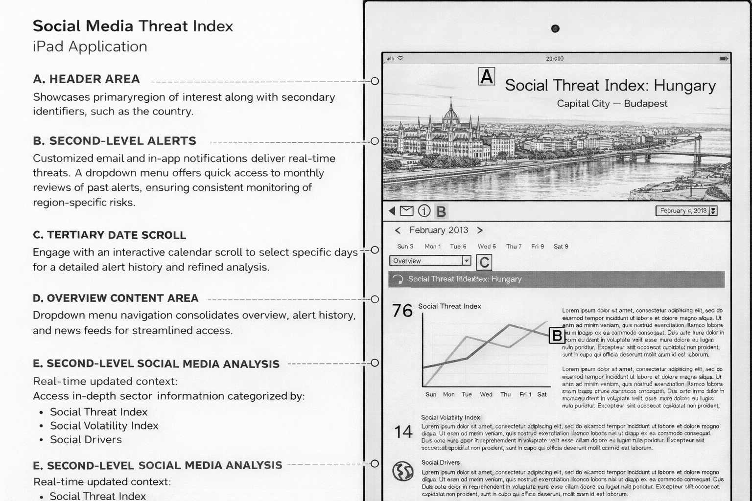 A geopolitical intelligence platform delivering real-time social media threat analysis across global regions. The Social Threat Index (STX) and Social Volatility Index (SVX) provide daily scored assessments of regional instability — surfacing civil unrest, governance, economic, and security signals drawn from social media activity. Designed for iPad, the application spans region selection, dashboard overview, volatility review, second-level analysis, and automated alert delivery.