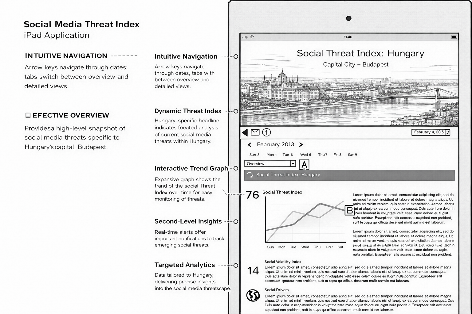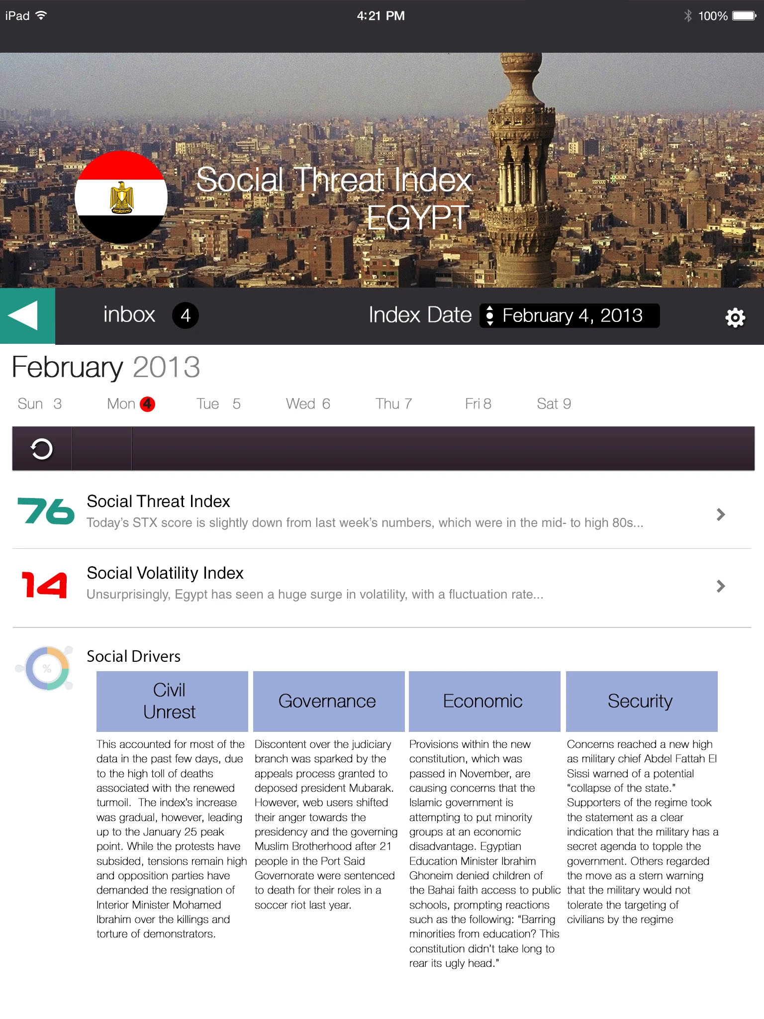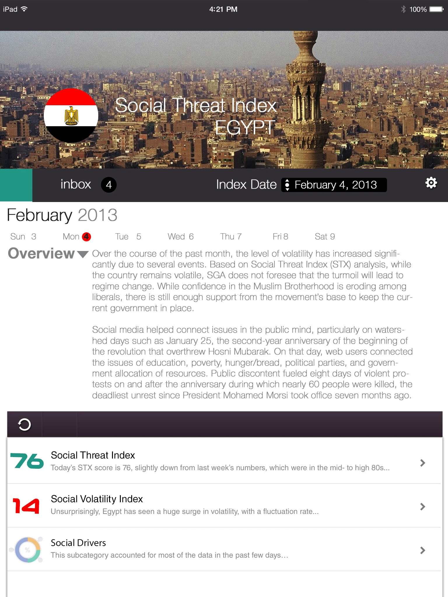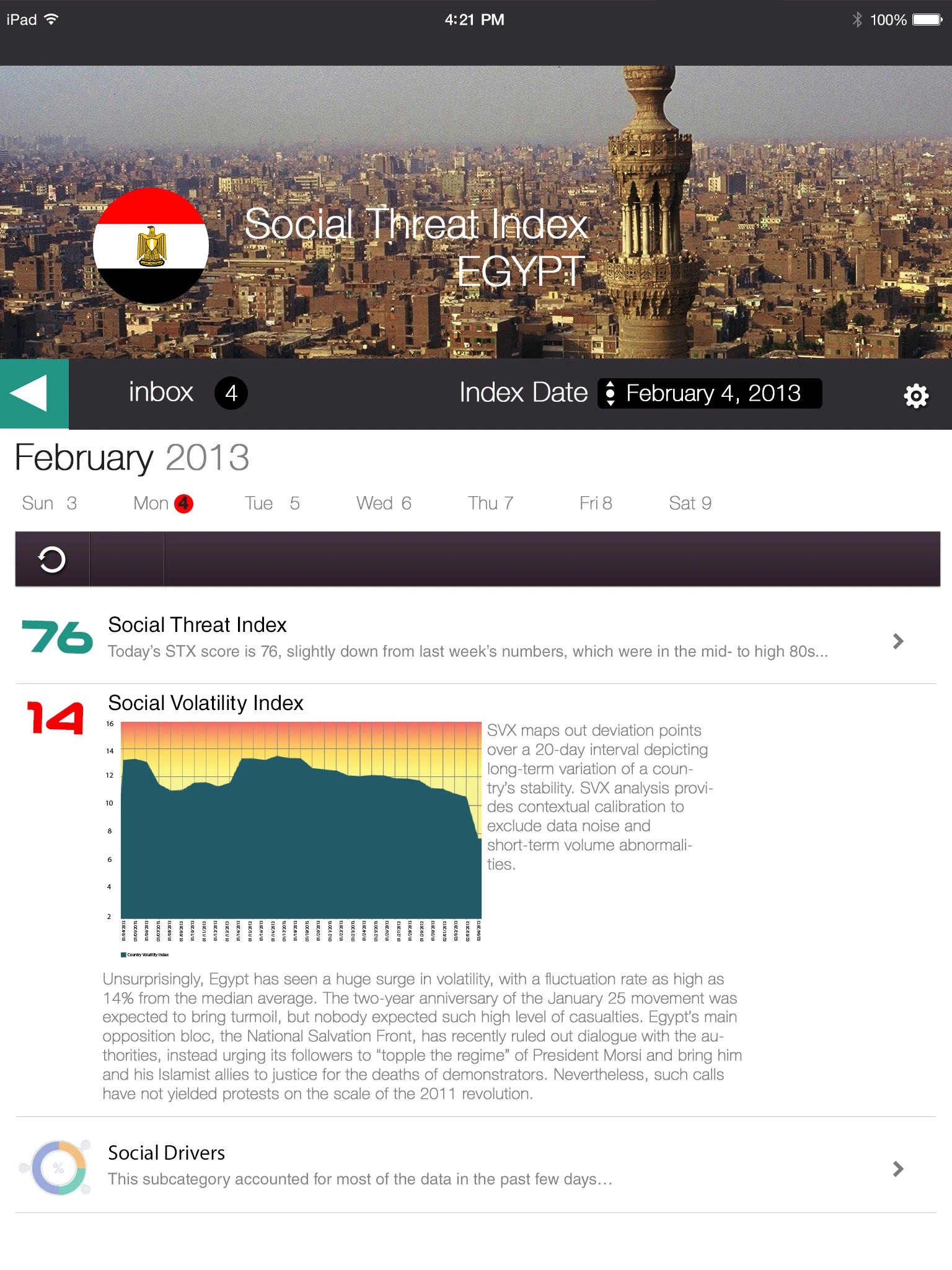 A geopolitical intelligence platform delivering real-time social media threat analysis across global regions. The Social Threat Index (STX) and Social Volatility Index (SVX) provide daily scored assessments of regional instability — surfacing civil unrest, governance, economic, and security signals drawn from social media activity. Designed for iPad, the application spans region selection, dashboard overview, volatility review, second-level analysis, and automated alert delivery.