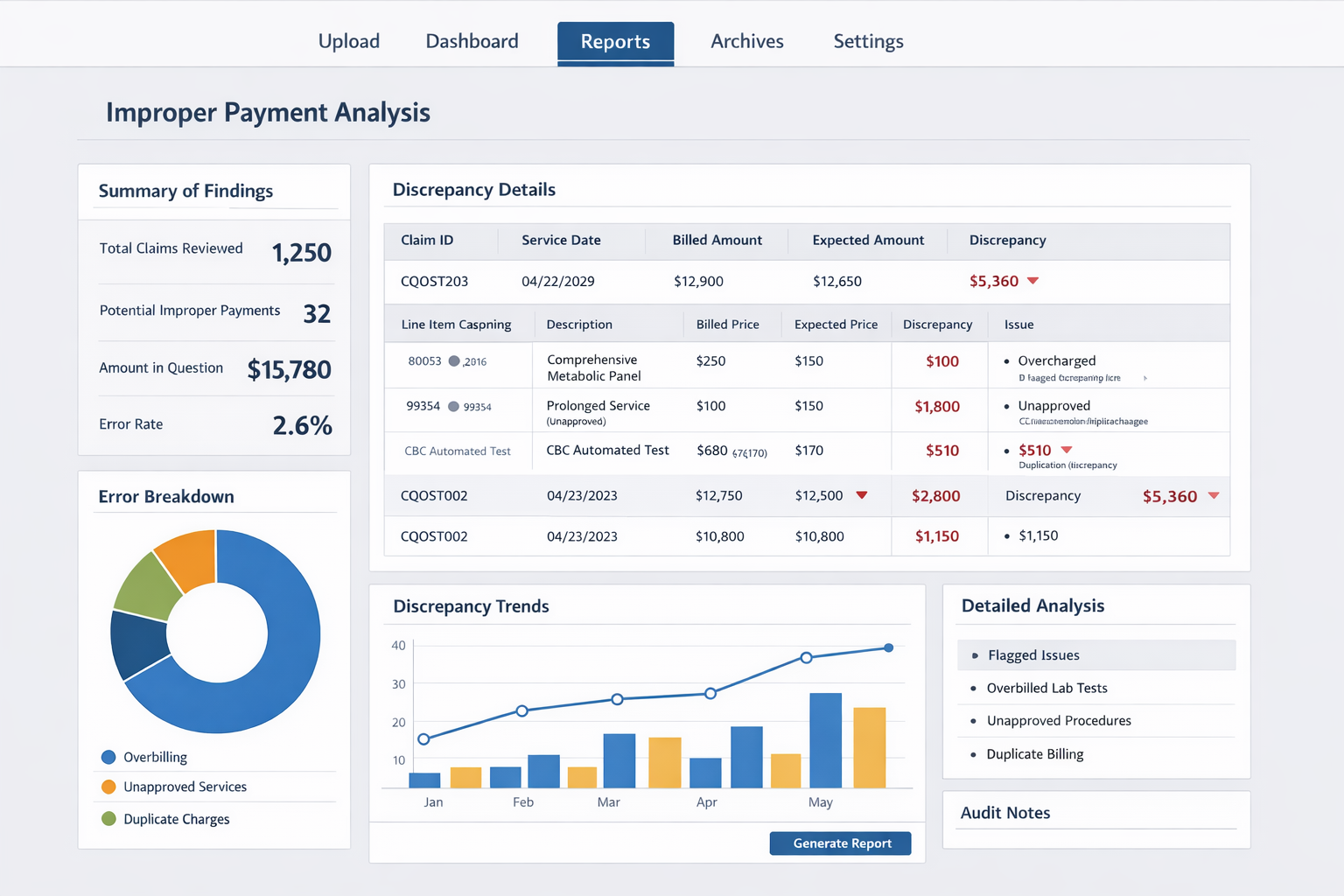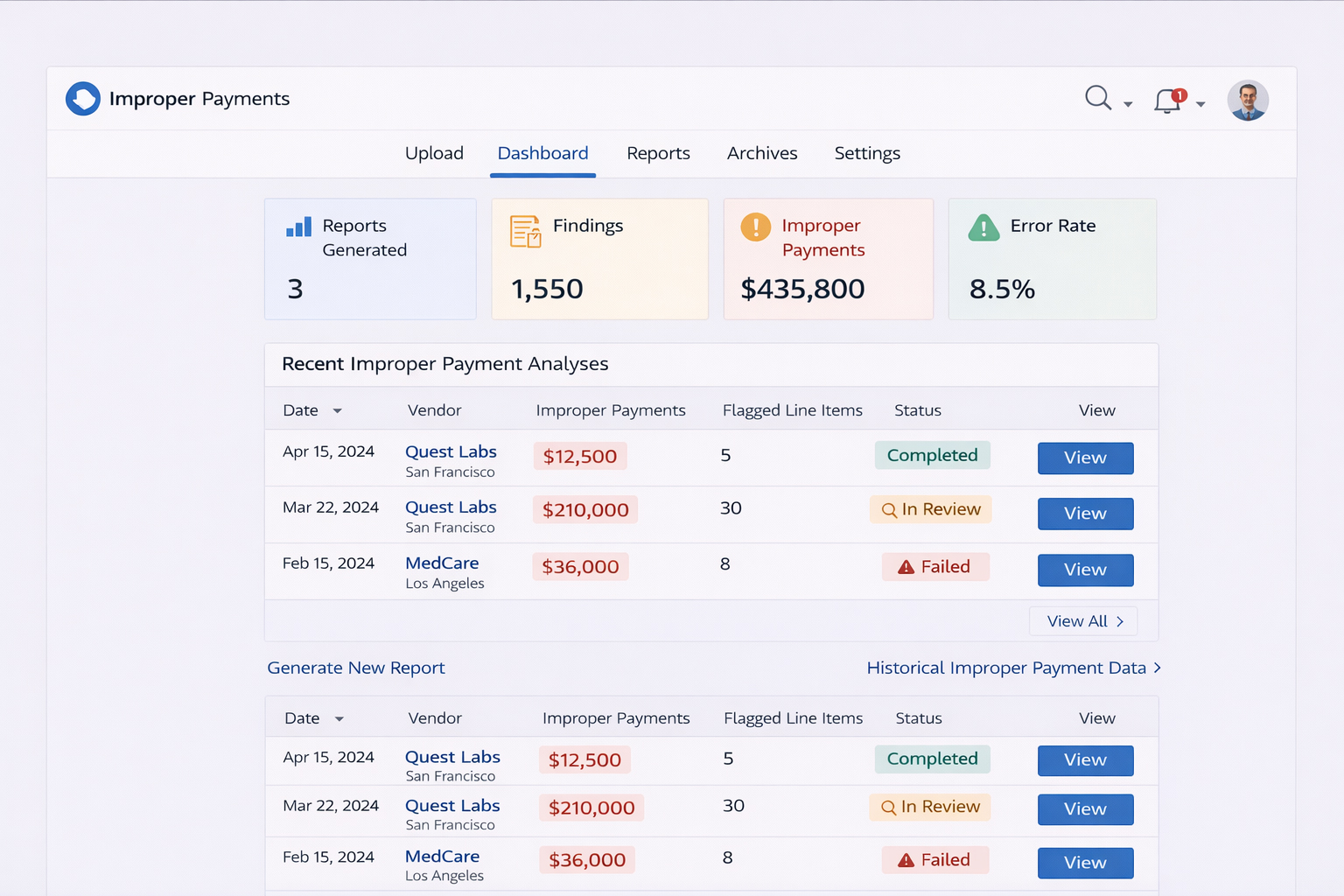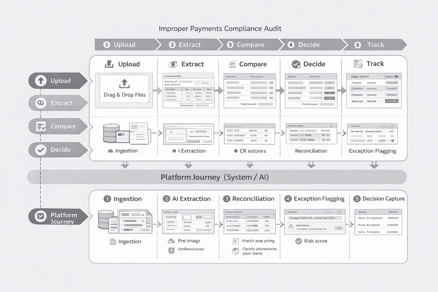 An AI-powered compliance auditing platform designed to detect improper payments in vendor billing. The system automates a five-stage pipeline — Upload, Extract, Compare, Decide, and Track — using AI extraction, contract reconciliation, and exception flagging to surface billing discrepancies across lab tests, medical services, and contracted vendor invoices. Designed for federal compliance auditors and procurement teams managing large-scale improper payment detection.