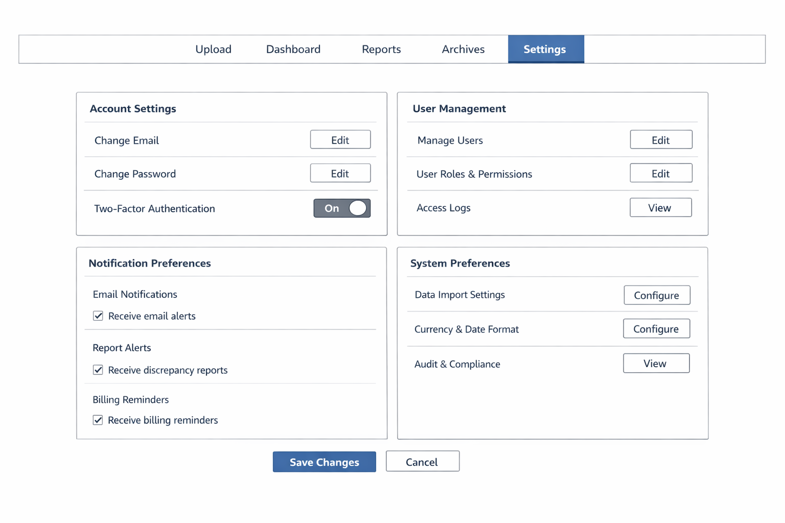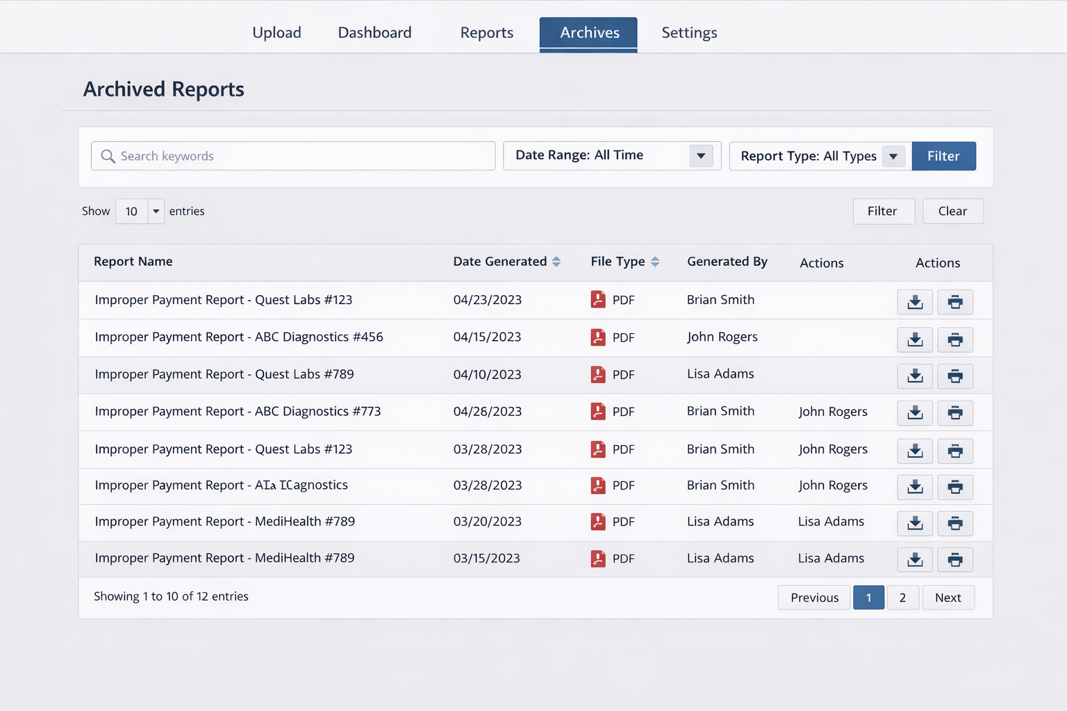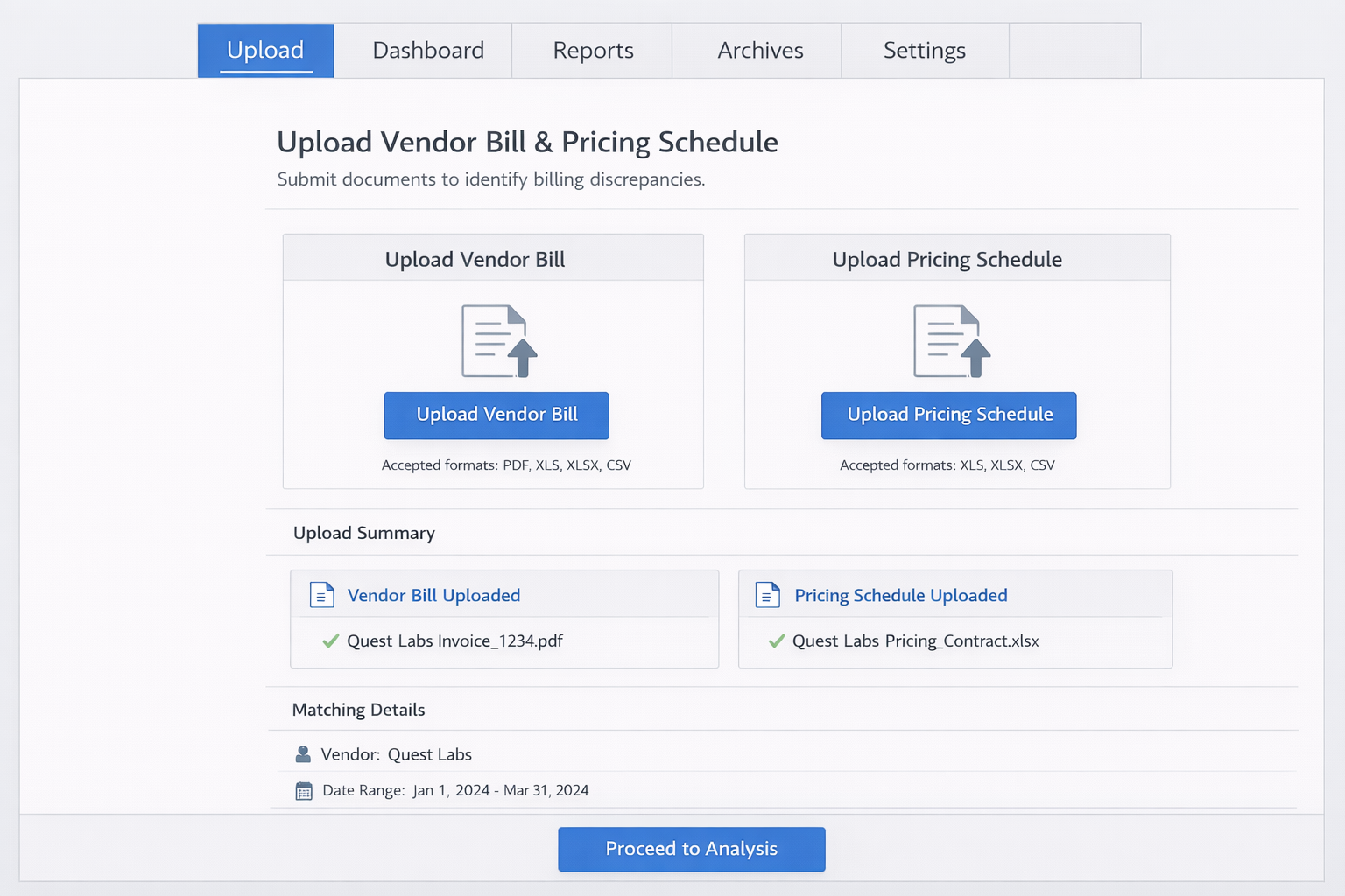 An AI-powered compliance auditing platform designed to detect improper payments in vendor billing. The system automates a five-stage pipeline — Upload, Extract, Compare, Decide, and Track — using AI extraction, contract reconciliation, and exception flagging to surface billing discrepancies across lab tests, medical services, and contracted vendor invoices. Designed for federal compliance auditors and procurement teams managing large-scale improper payment detection.